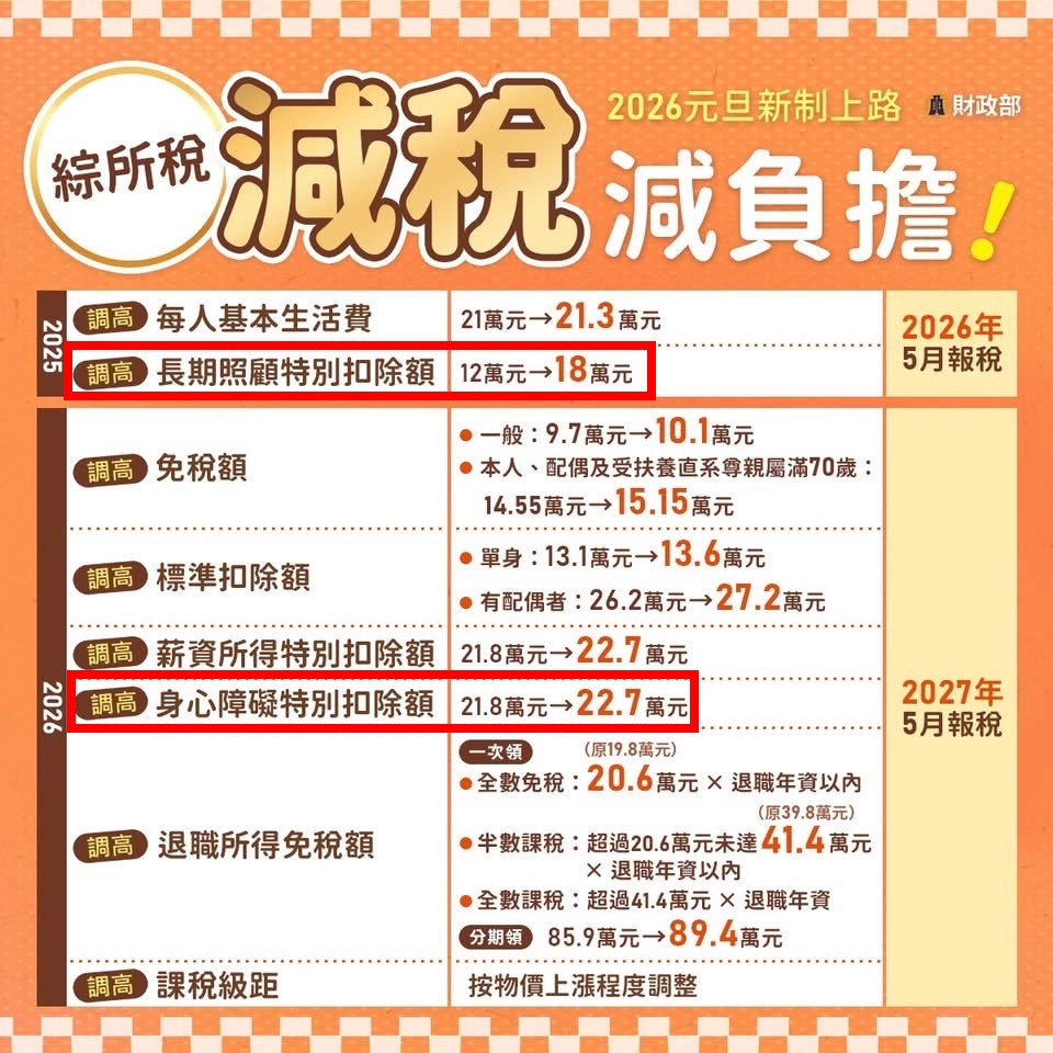 綜合所得稅調高長期照顧特扣除額及身心障礙特別扣除額