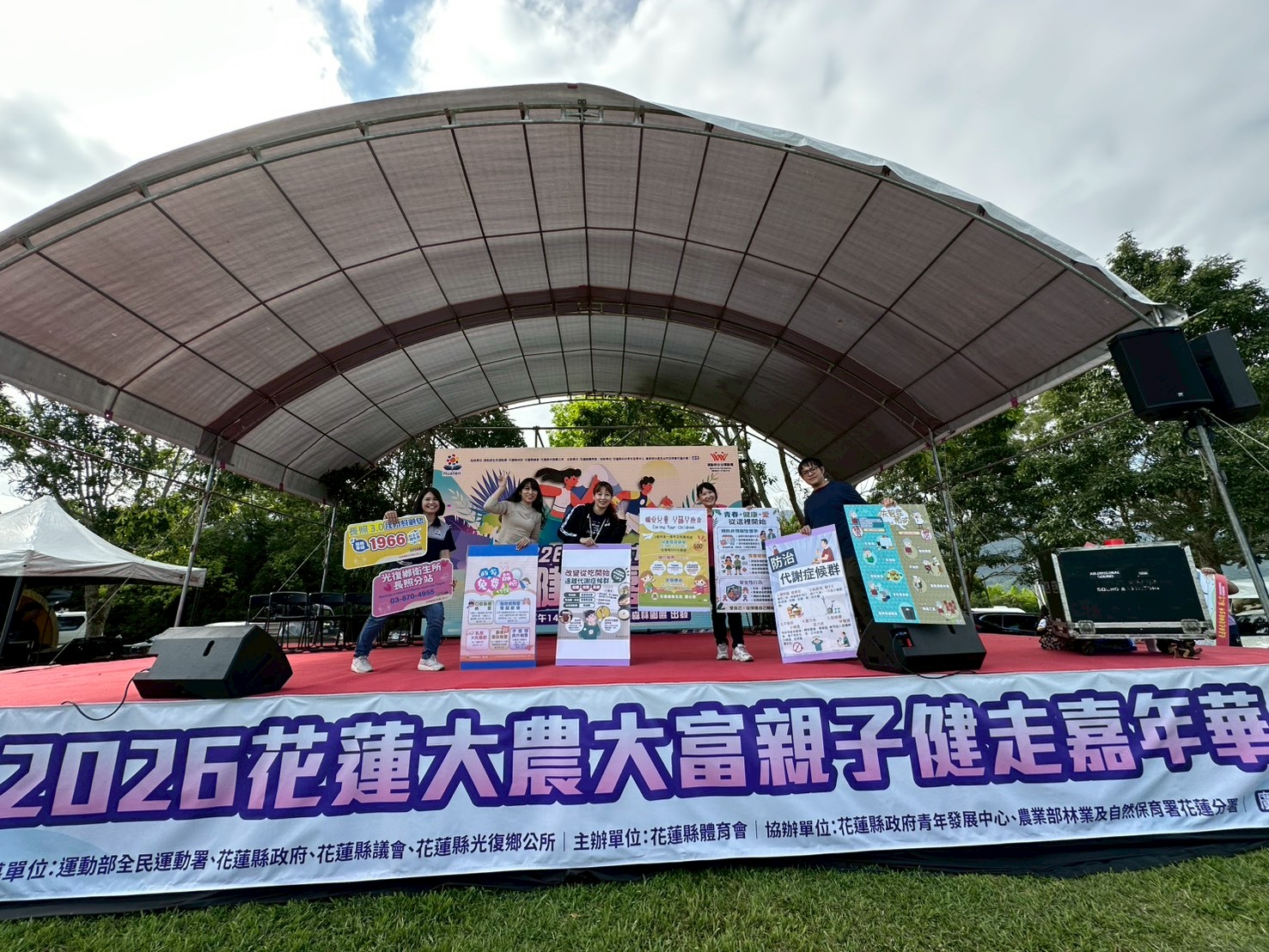 花蓮縣政府於115年3月15日(星期日)下午1時至5時,在光復鄉大農大富平地森林園區遊客中心前廣場舉辦「2026大農大富青年創意市集」,並結合親子健走嘉年華活動。活動現場天氣晴朗、氣氛熱絡,吸引許多民眾攜家帶眷參與健走與市集活動,透過健康休閒活動促進親子互動與在地觀光,同時結合政令宣導攤位,推廣政府各項公共政策與服務資訊。