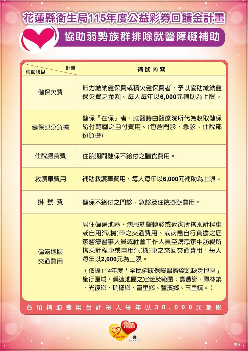 補助項目:健保欠費、掛號費、健保部分負擔、住院膳食費用、救護車費用等,以上各項補助費用合計每人每年以3萬元為上限。
